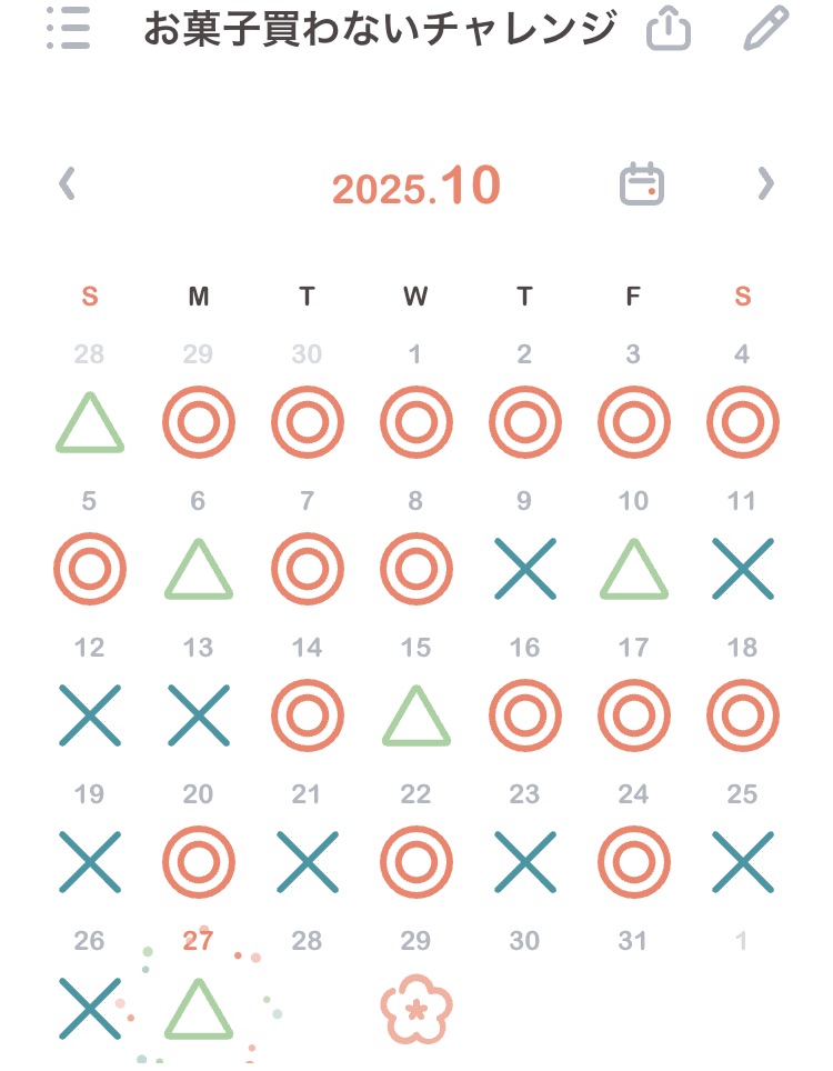 駆け込みで、ハロウィン終わる前に食べたい物急いで買いに行っているから毎日×か△になる。