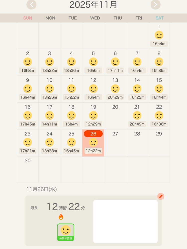 昨日食べた時間が遅かったので16時間未達成。