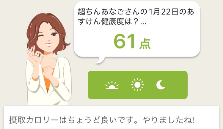 あすけんに朝ジョギングで消費したカロリーを記入してみたら、点数が高くなった。